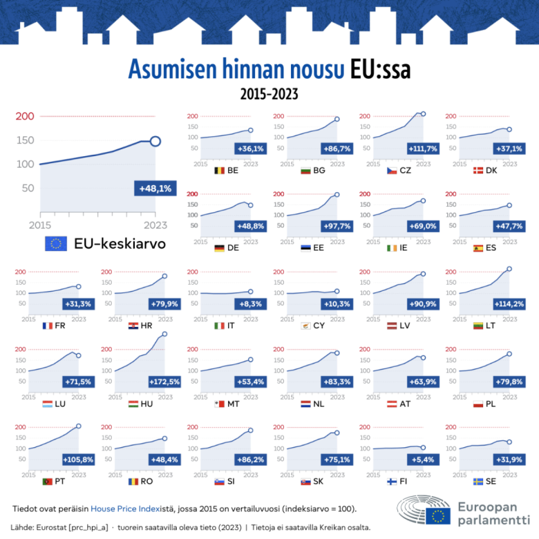 Kohtuuhintaisten asuntojen puute on yhä suurempi ongelma kaikkialla Euroopassa. Alle kymmenessä vuodessa, vuosina 2015–2023, asuntojen hinnat nousivat EU:ssa keskimäärin 48 prosenttia. Eniten hinnat nousivat Unkarissa, 173 prosenttia, ja vähiten Suomessa, missä hinnat nousivat vain 5 prosenttia.